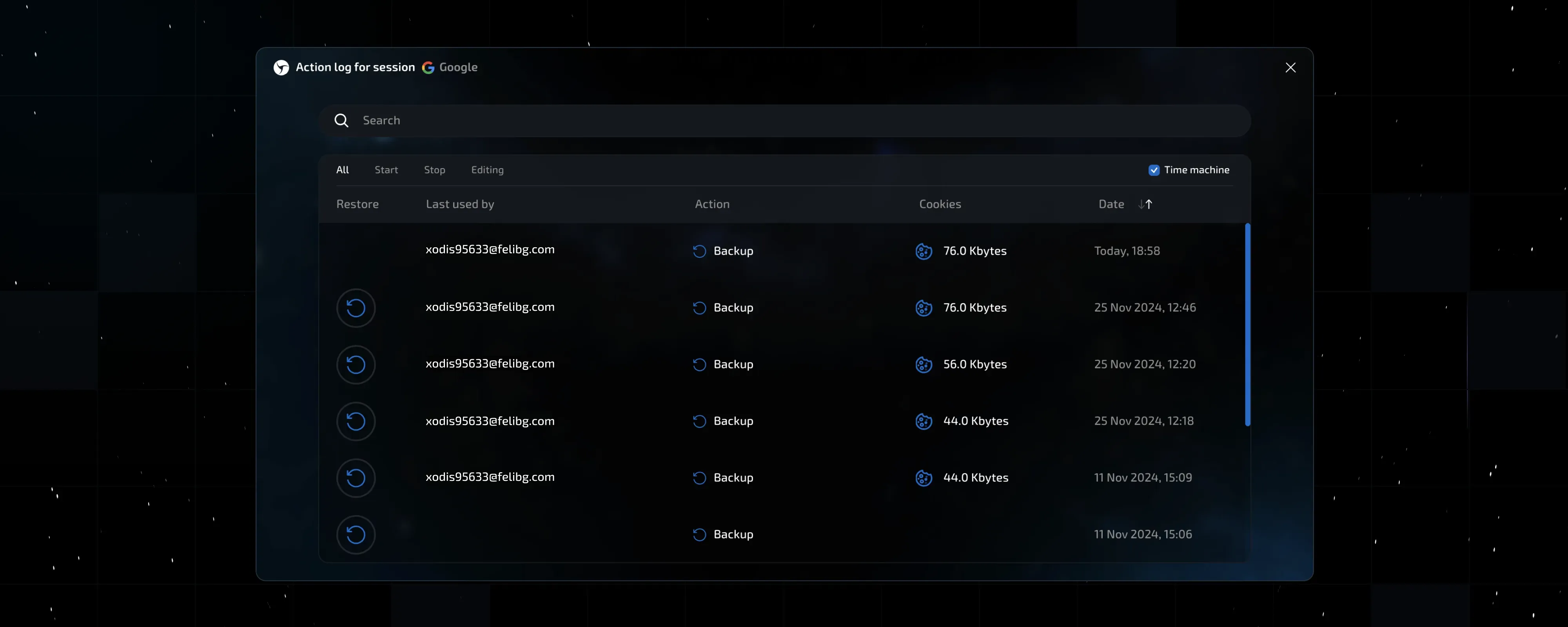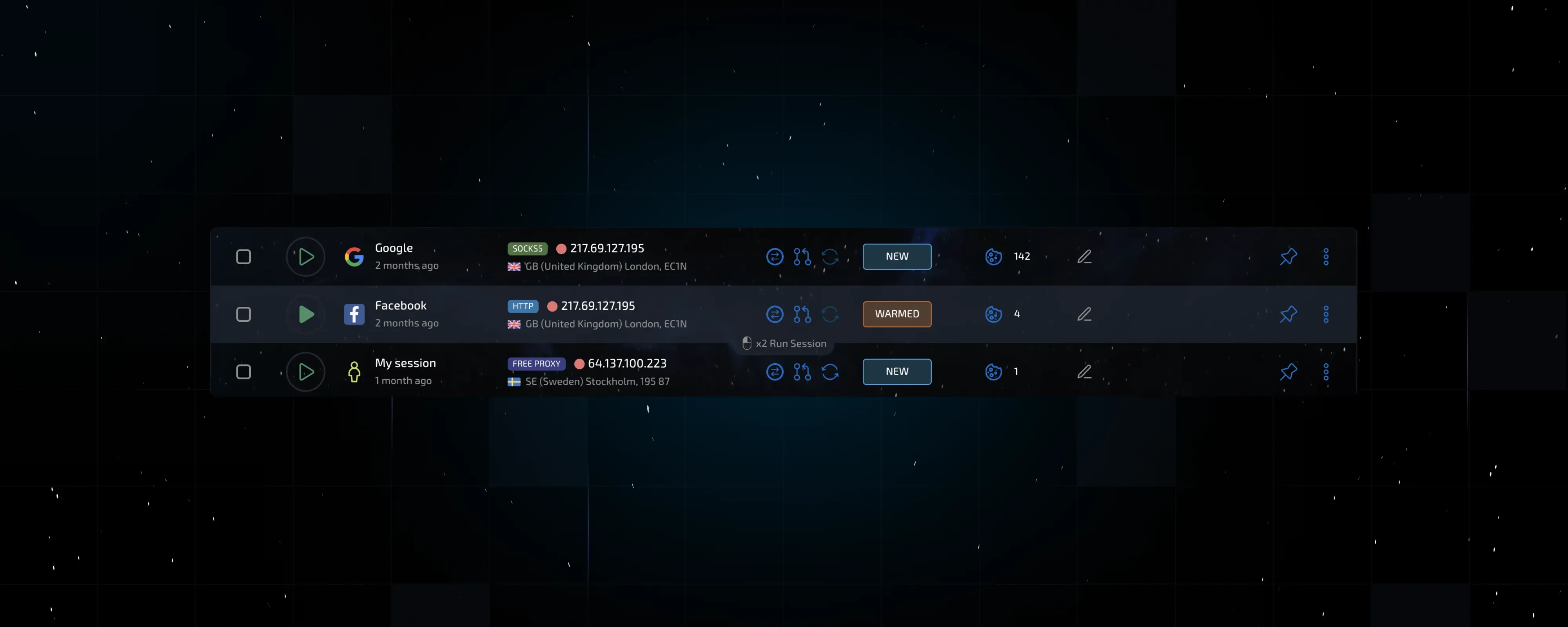 Changes have also been made to the session management field. Since the release of version 9, Linken Sphere offered numerous session sorting options, including a general session timer. Unfortunately, many users overlooked this feature. Something needed to be done, so now the sorting type has been moved to the block header, making it much more convenient and visually accessible. We also responded to your request for quick filtering of active and pinned sessions by adding this feature as well.