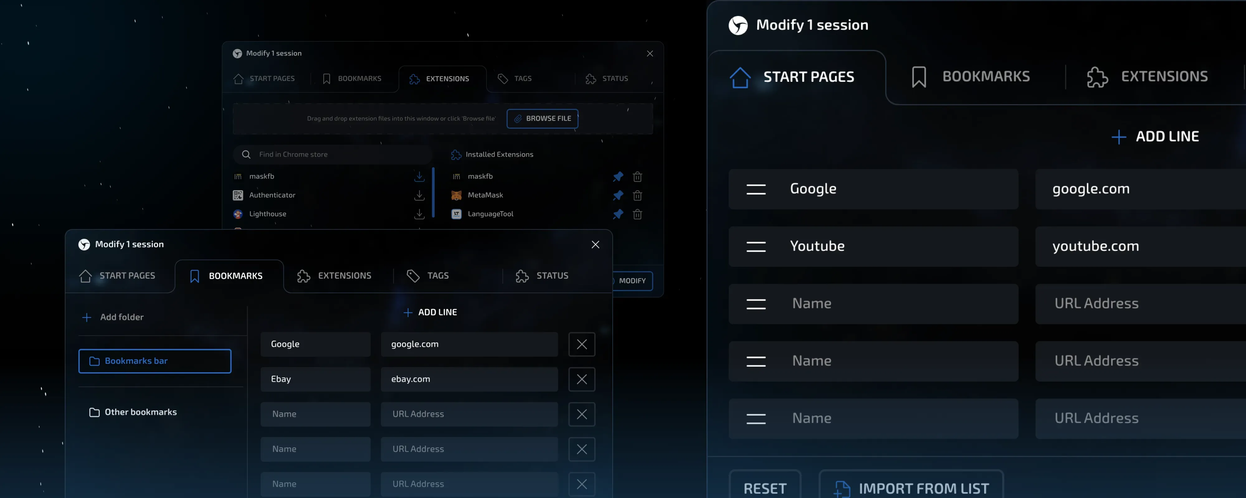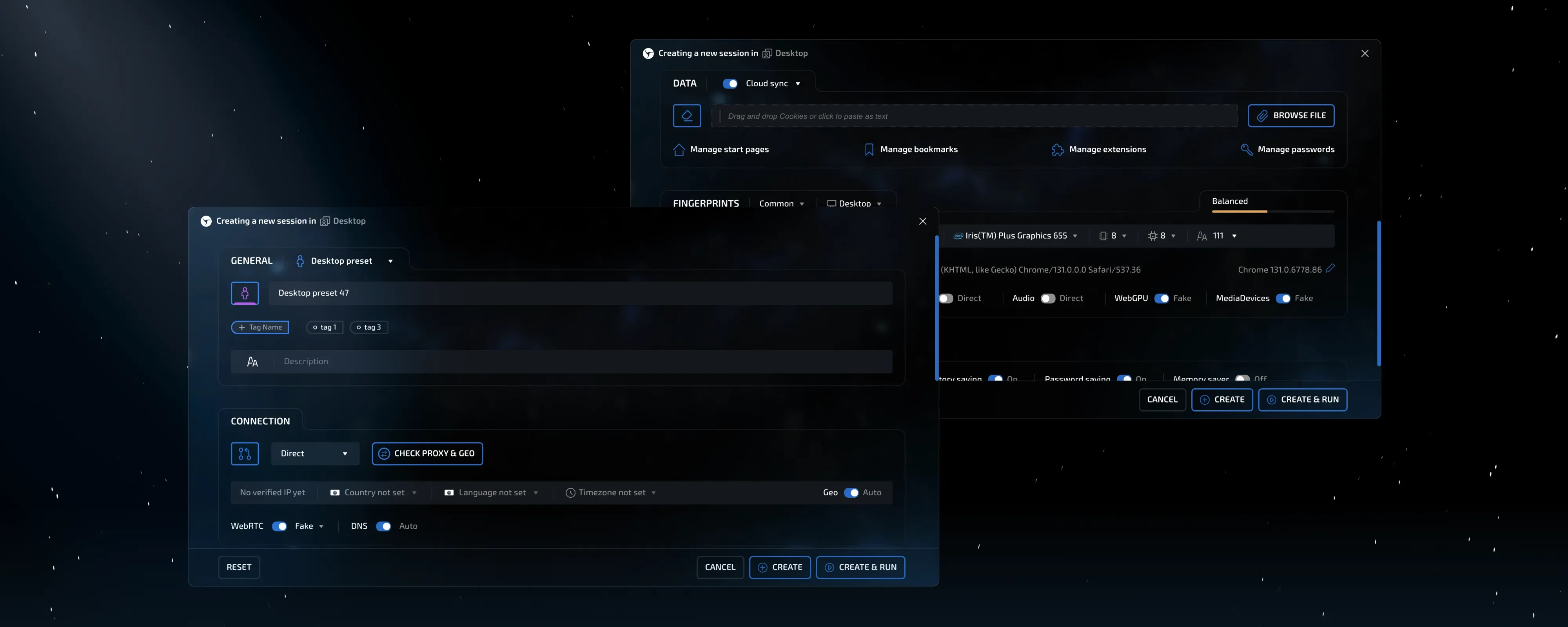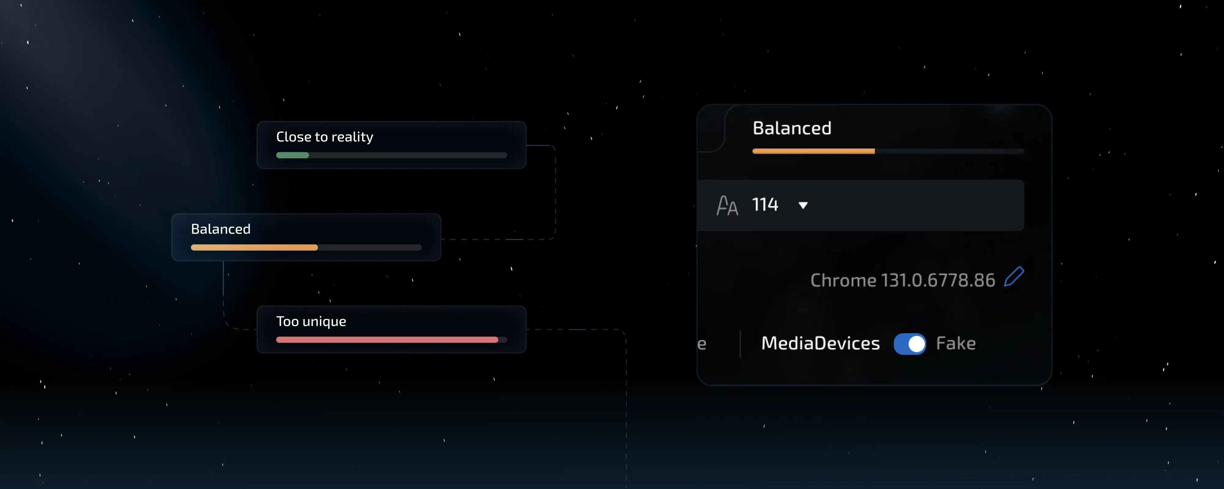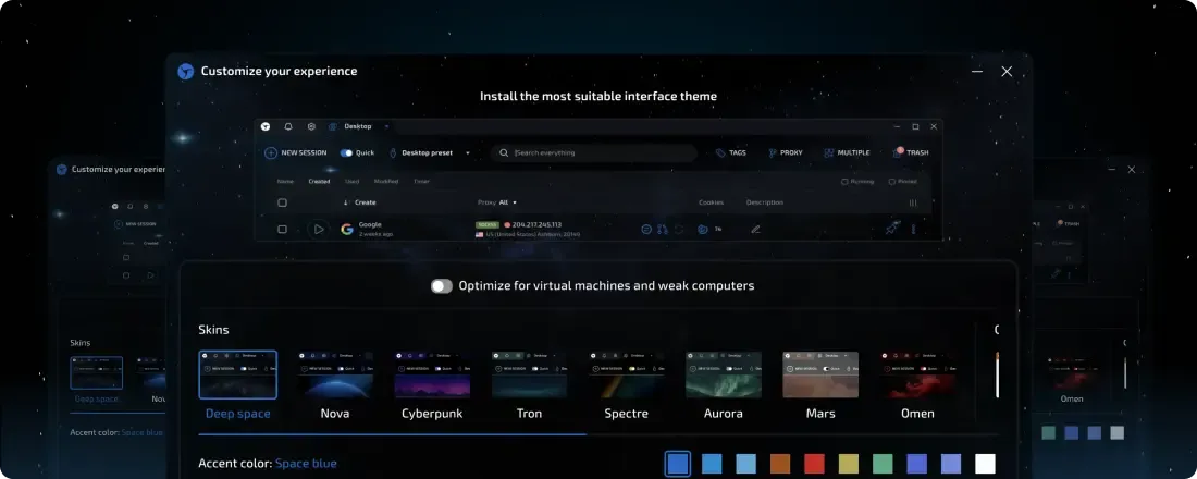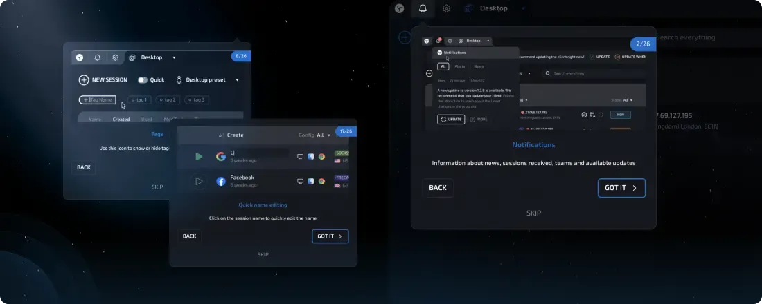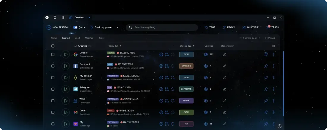 To set a new quality standard and benchmark for the market. To create the best, most effective, and technologically advanced anti-detect that anyone can learn to use in just a few minutes. And, despite its technological sophistication and extensive capabilities, to make it fast, reliable, and breathtakingly beautiful. Aesthetics play a huge role in how we perceive the world, so why should a daily working tool look like a relic from the Windows XP era?