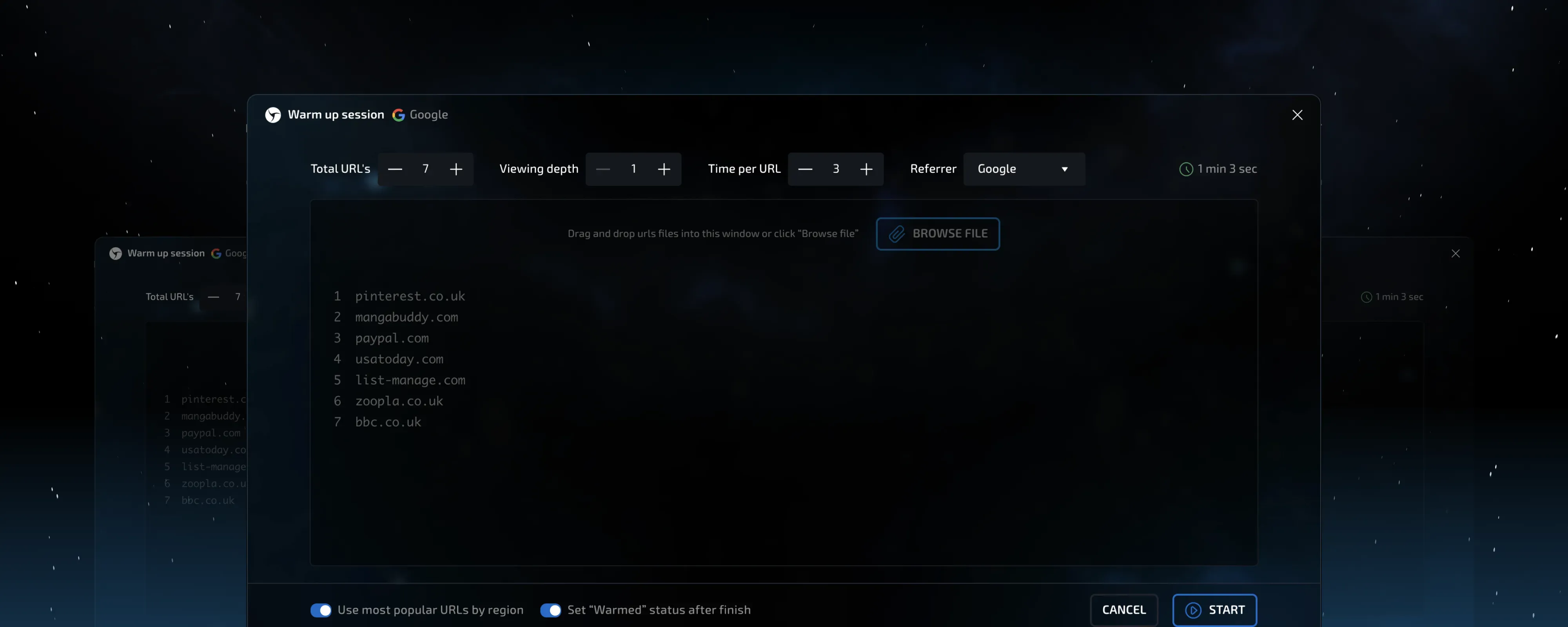 But that’s not all. For the first time on the market, the warming-up mode offers a customizable feature for simulating website visits from search engines. When you launch the warming-up process, the browser doesn’t navigate directly to a page but instead reaches it through a search engine. It doesn’t just stay on the page to quickly collect cookies but explores the specified resource in depth.