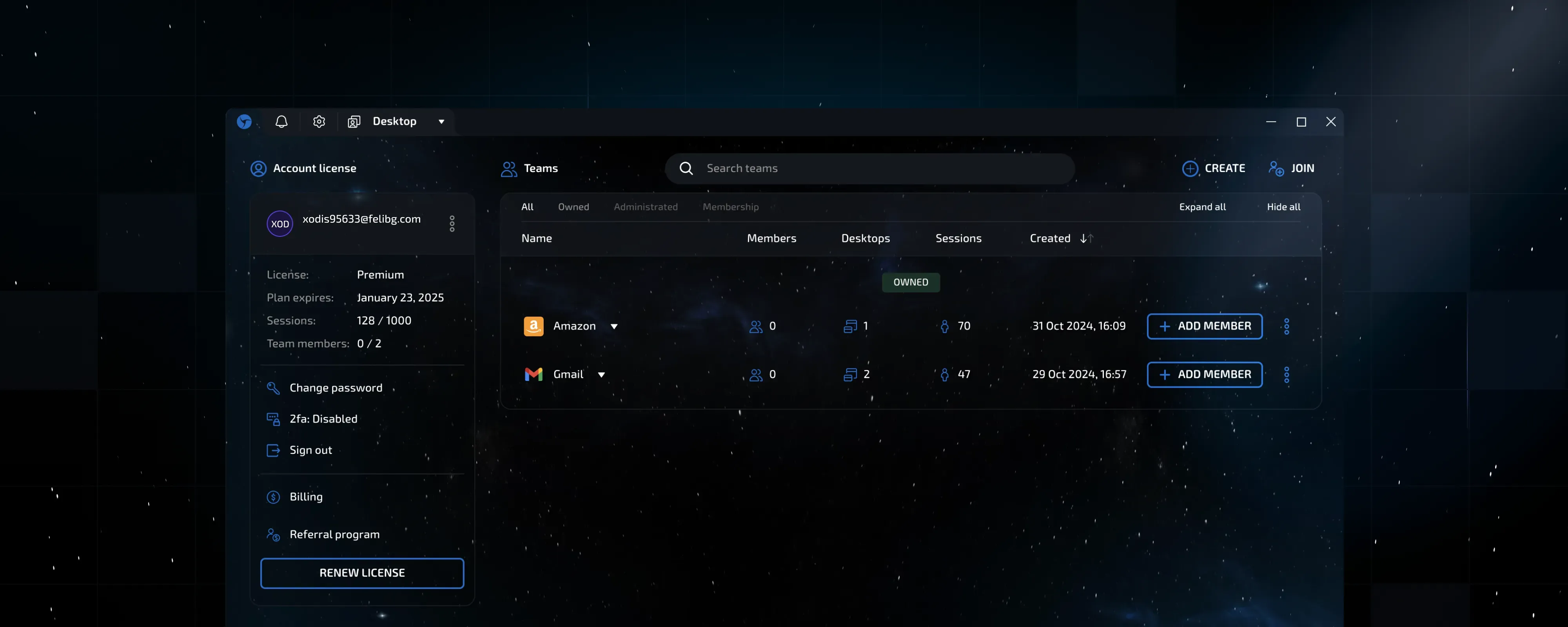 Now, teams take center stage in the account section, enabling the implementation of several excellent innovations: you now have team search functionality, and each team displays key details—such as the number of members, workspaces, sessions, and the creation date.