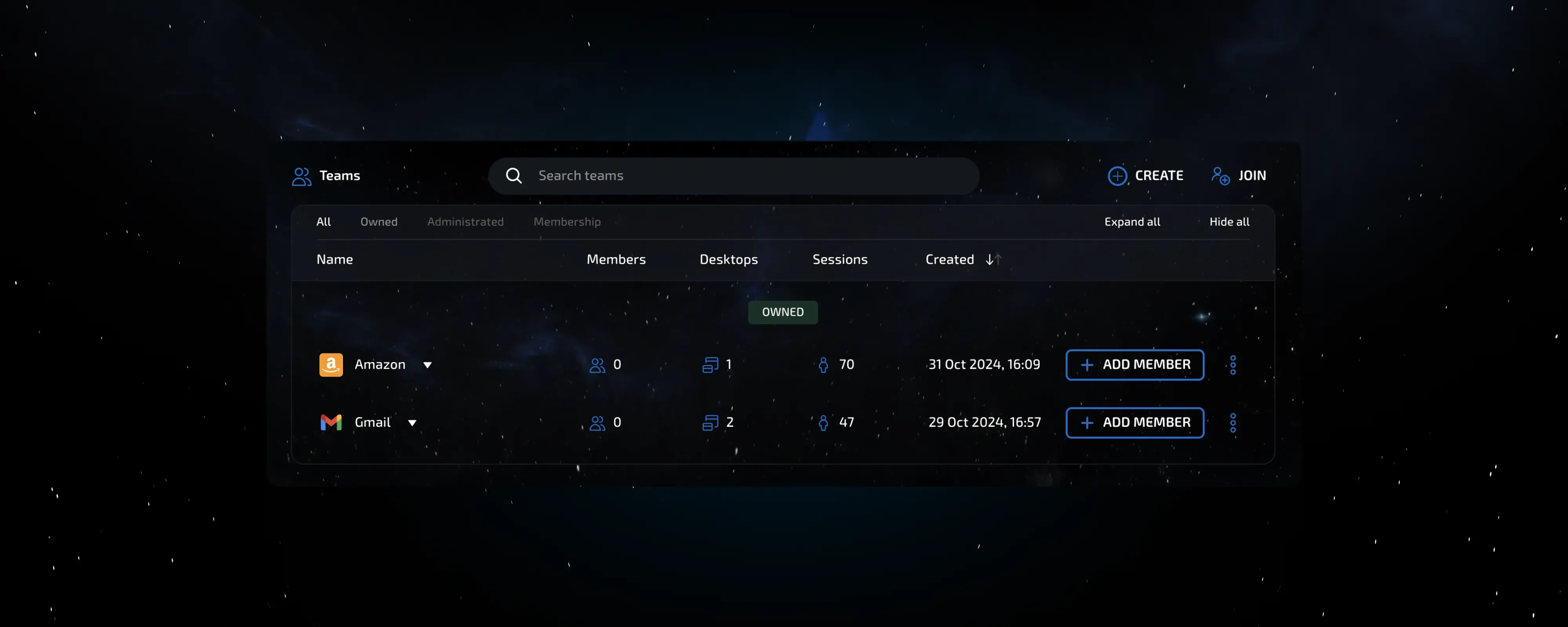 You can filter teams based on their association with your account and quickly expand or collapse data about team members.