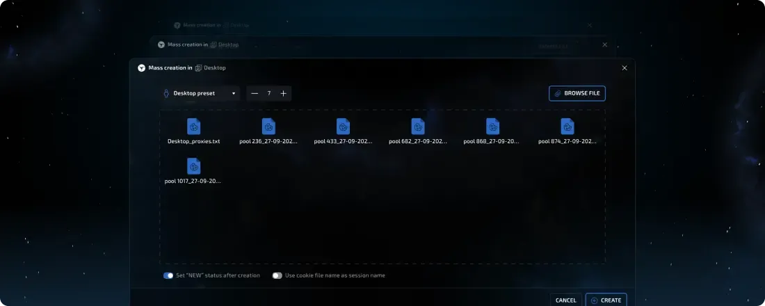 The configuration pool is now another available mode of the integrated antidetect tool, usable both in individual sessions and in presets. Furthermore, you can even create configuration lists for use in presets, similar to how proxy lists work!