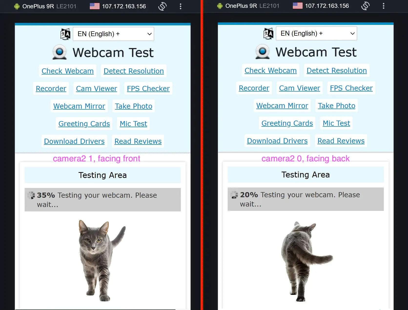 Then select the cameras and click the "Test my cam" button. You can open two tabs with the site and launch different cameras in each tab.