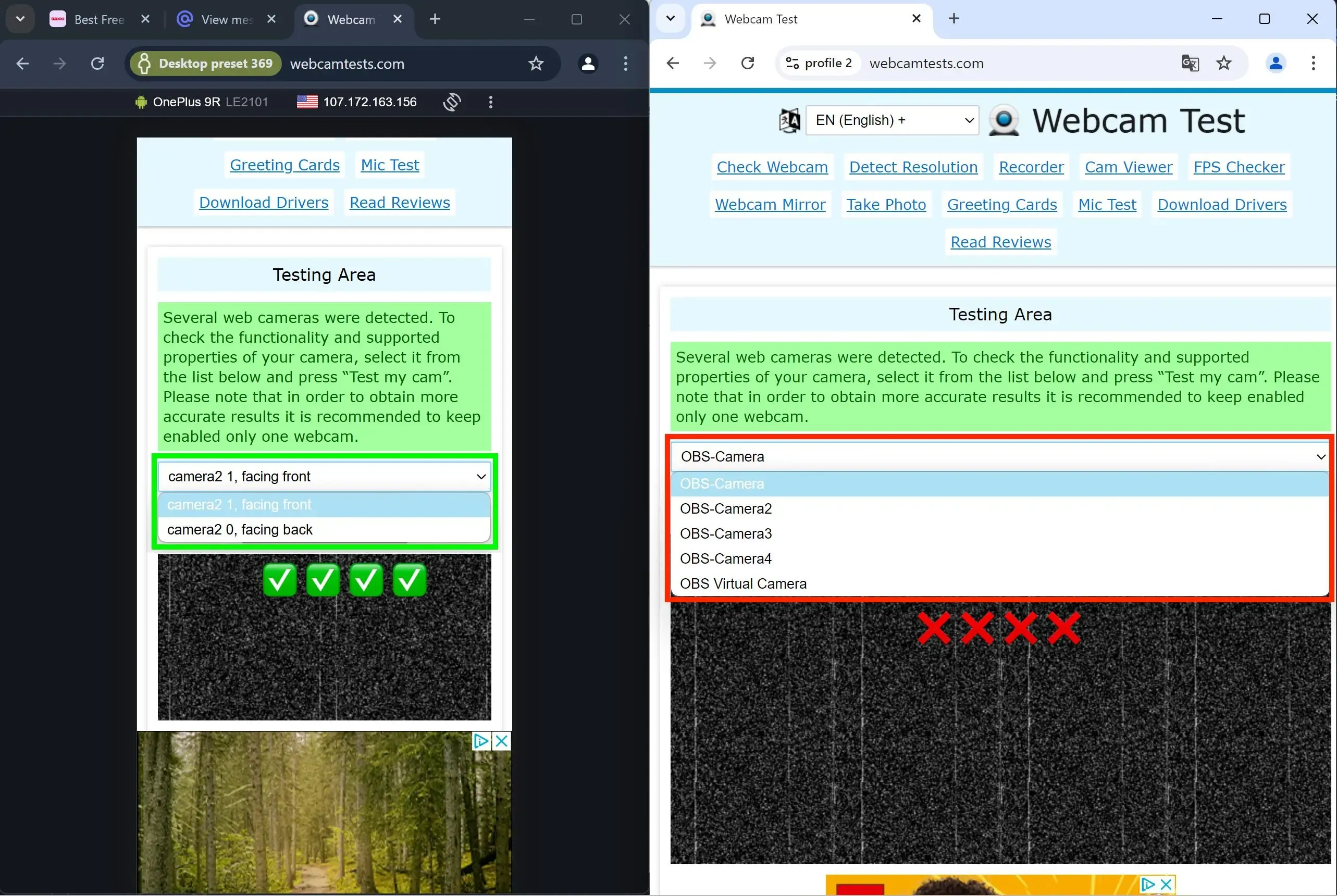 For other configurations with more cameras, you may need to create additional scenes in OBS, but the principle remains the same. You can check the number of cameras in a specific config on the website webcamtests.com, as shown below.