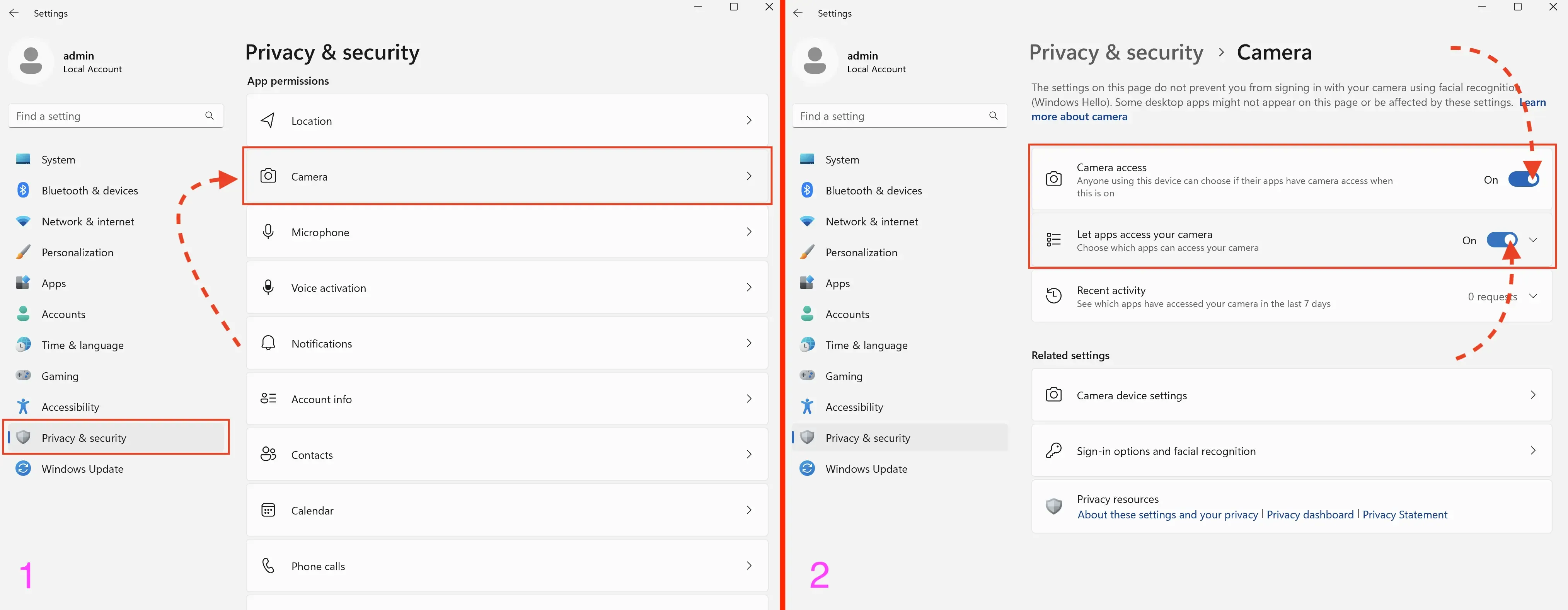 - Enable Allow access to the camera on this device and Allow apps to access your camera
