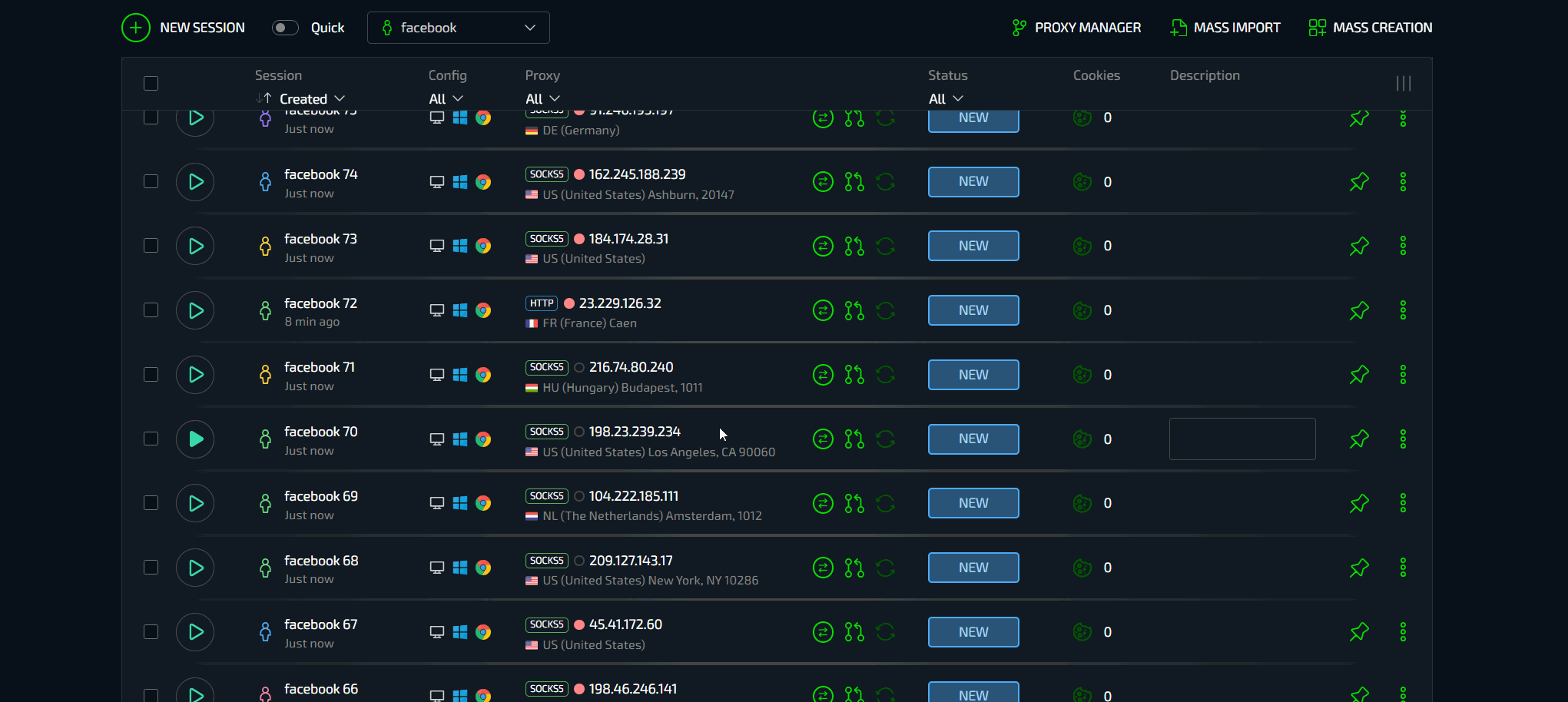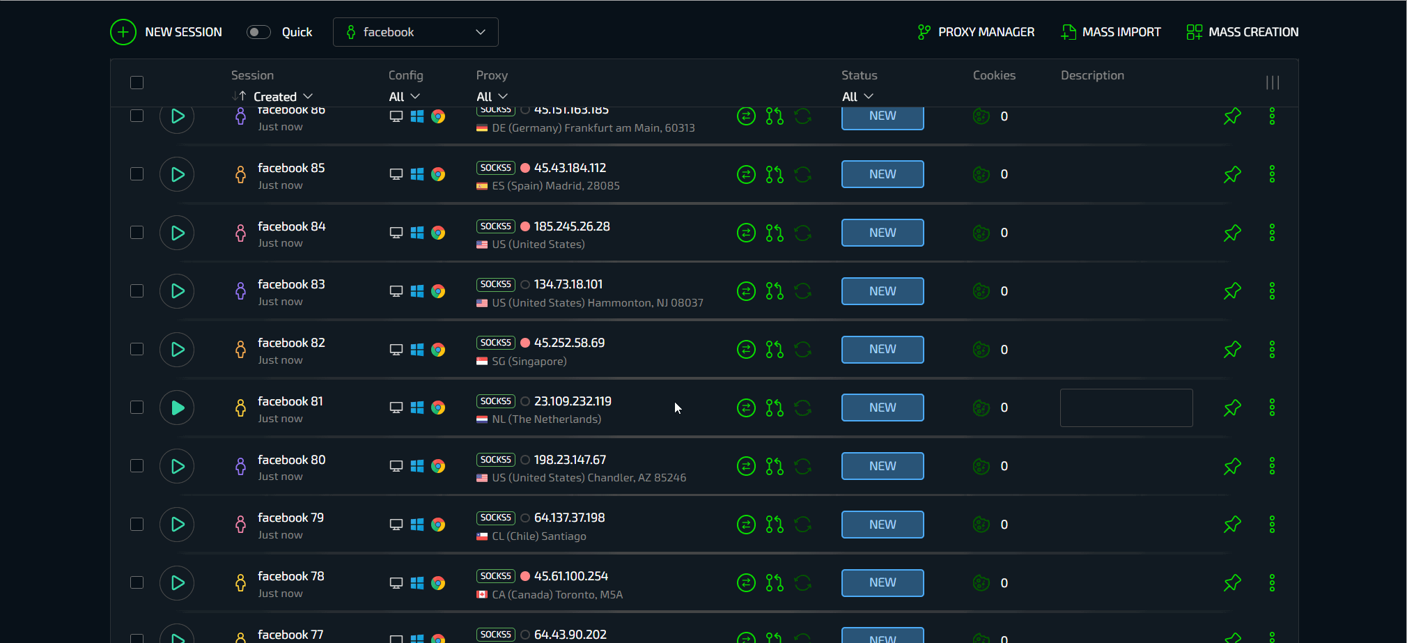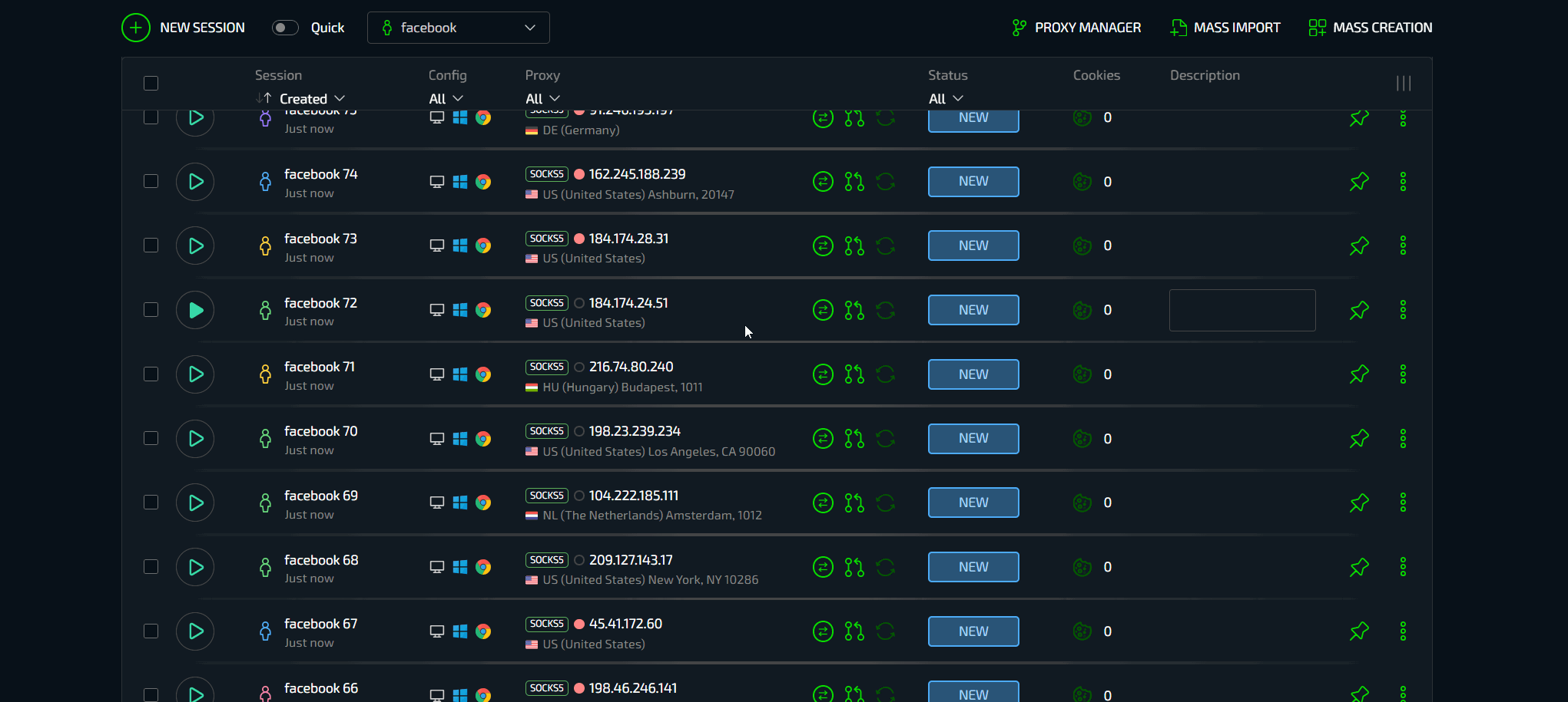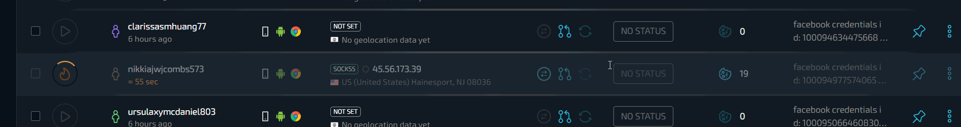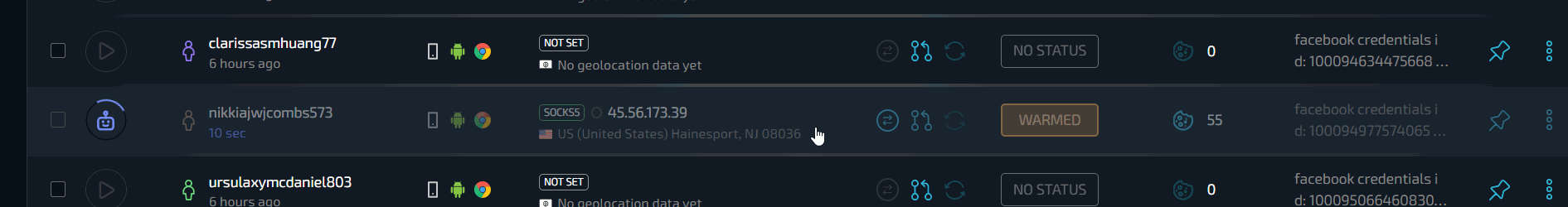 А что, если нужно создать сразу 100 профилей или импортировать покупные аккаунты Facebook? И здесь вишенка на торте - провайдер в условиях работы с большим количеством профилей. В Сфере есть сразу несколько эксклюзивных функций, обеспечивающих невероятно мощные условия для работы с большими объемами данных - массовое создание и массовый импорт.
