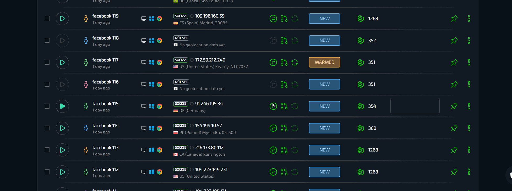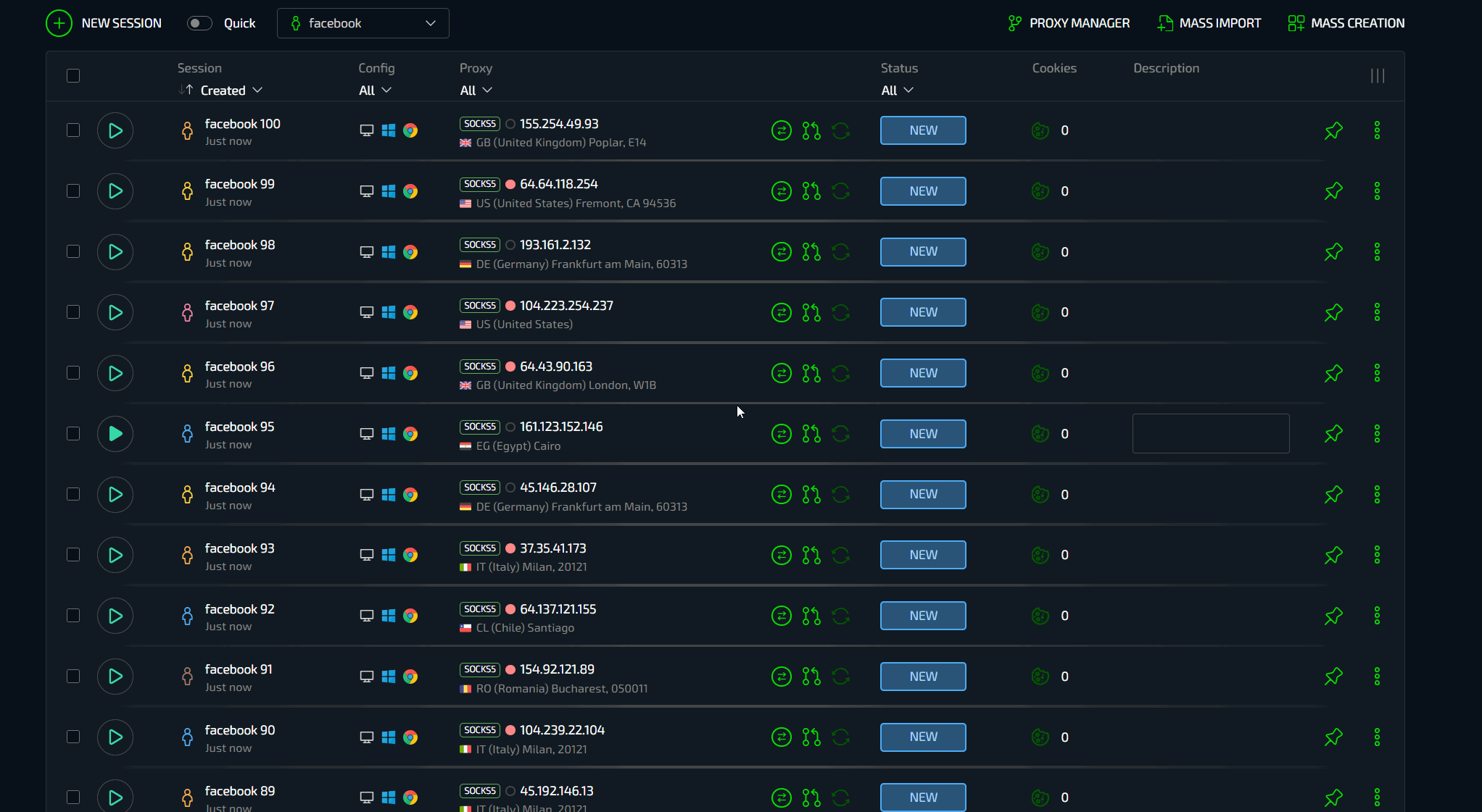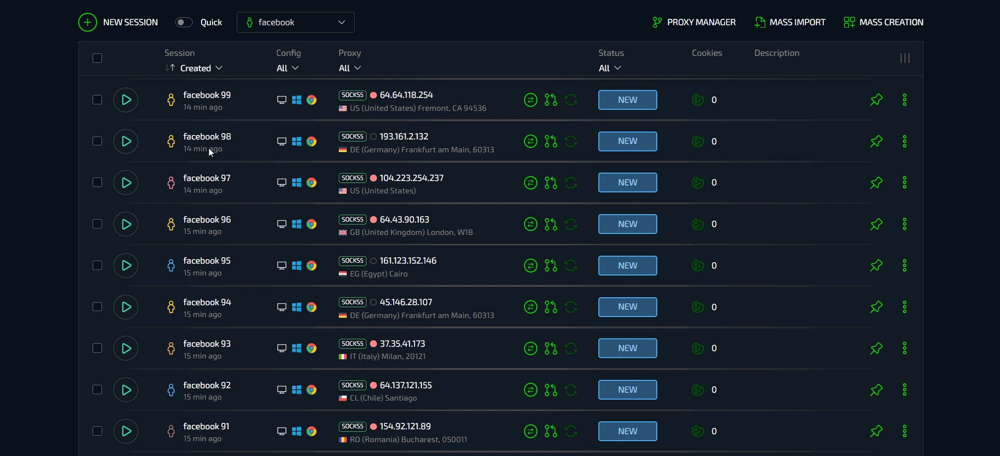 А что, если нужно создать сразу 100 профилей или импортировать покупные аккаунты Facebook? И здесь вишенка на торте - провайдер в условиях работы с большим количеством профилей. В Сфере есть сразу несколько эксклюзивных функций, обеспечивающих невероятно мощные условия для работы с большими объемами данных - массовое создание и массовый импорт.