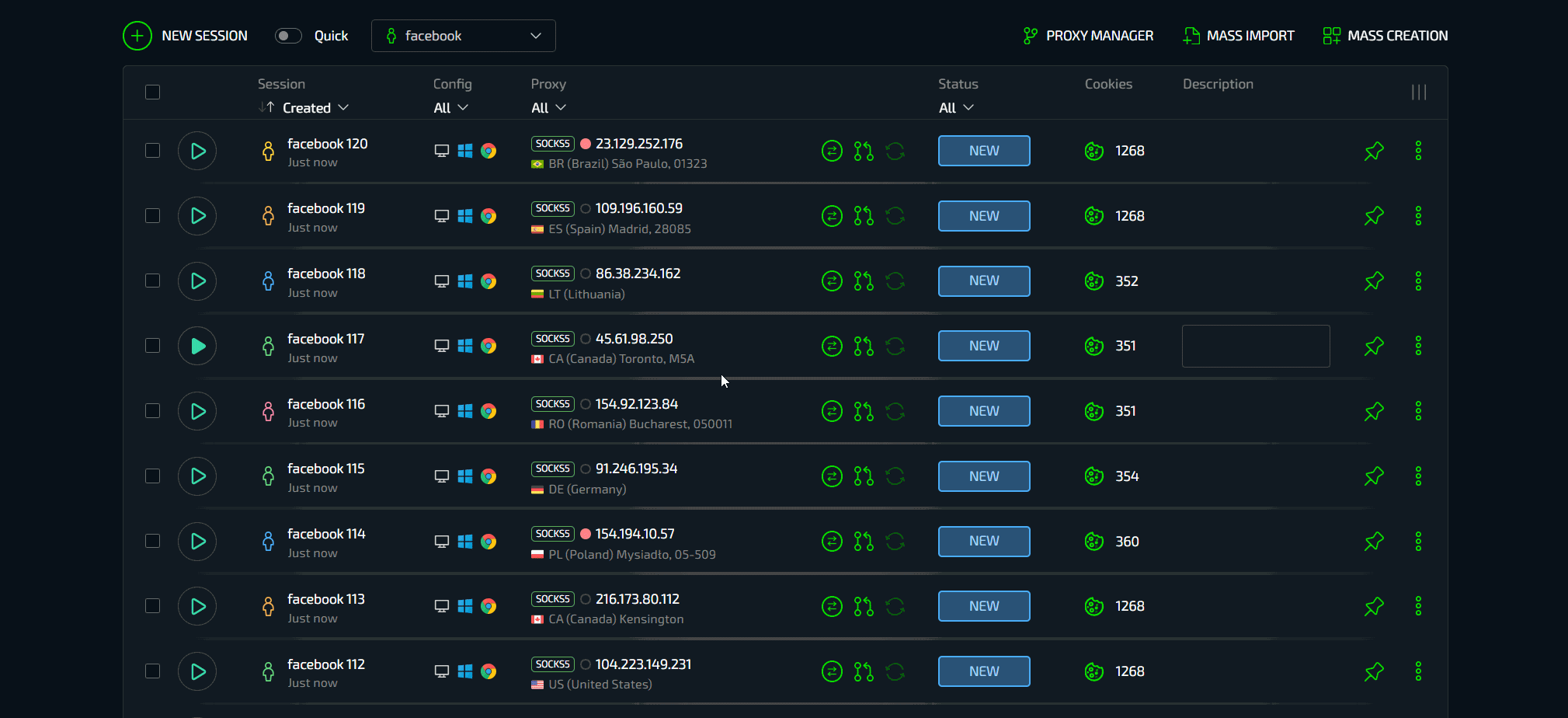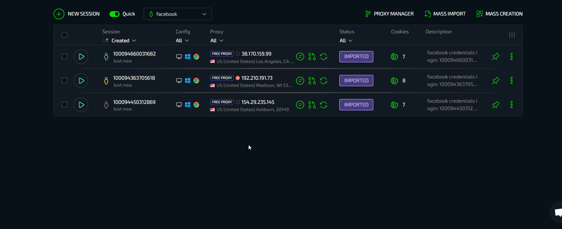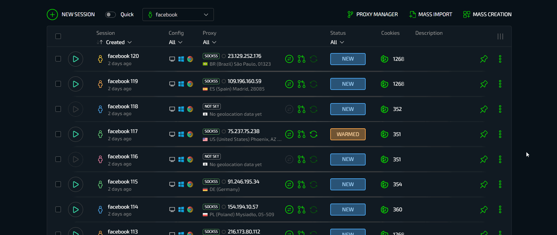 Массовый импорт позволяет с легкостью заводить большое количество аккаунтов в Сферу без необходимости их вставки в документики или любой другой подготовки. Есть аккаунты Facebook - выберите их все и загрузите. Браузер сам найдет и установит все данные от аккаунтов - конфигурацию, cookies, описание, гео и автоматически загрузит их в виде готовых профилей. Установите прокси, можно массово. Готово.