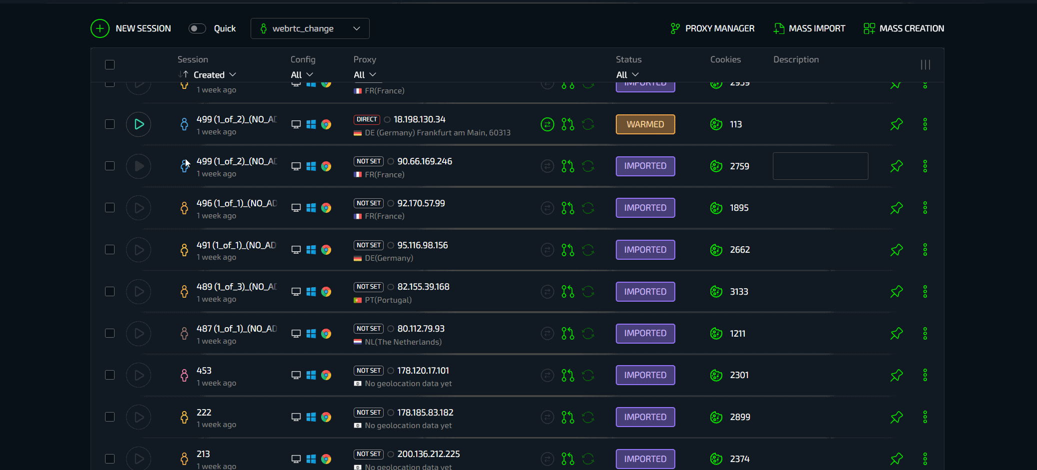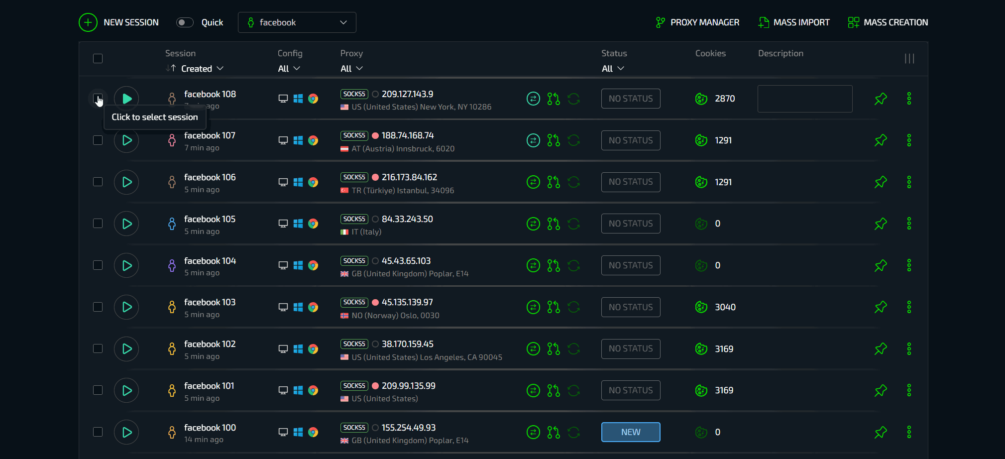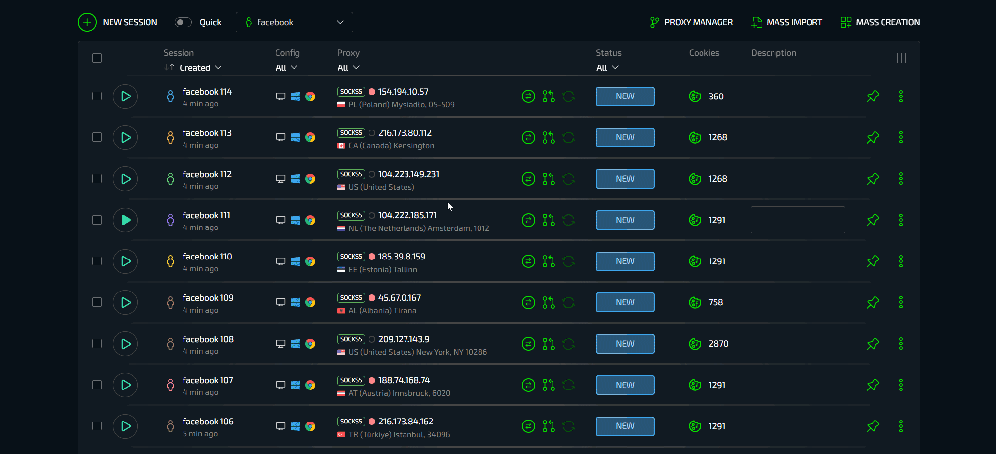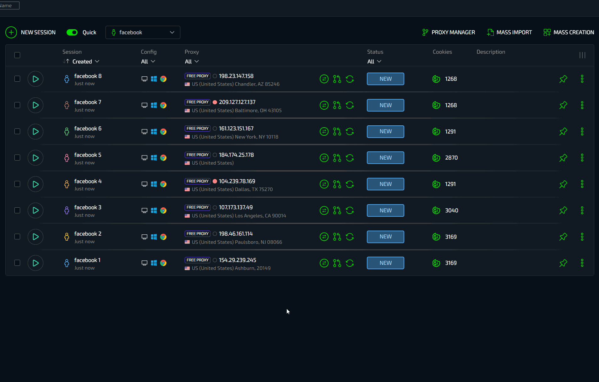 Массовый импорт позволяет с легкостью заводить большое количество аккаунтов в Сферу без необходимости их вставки в документики или любой другой подготовки. Есть аккаунты Facebook - выберите их все и загрузите. Браузер сам найдет и установит все данные от аккаунтов - конфигурацию, cookies, описание, гео и автоматически загрузит их в виде готовых профилей. Установите прокси, можно массово. Готово.