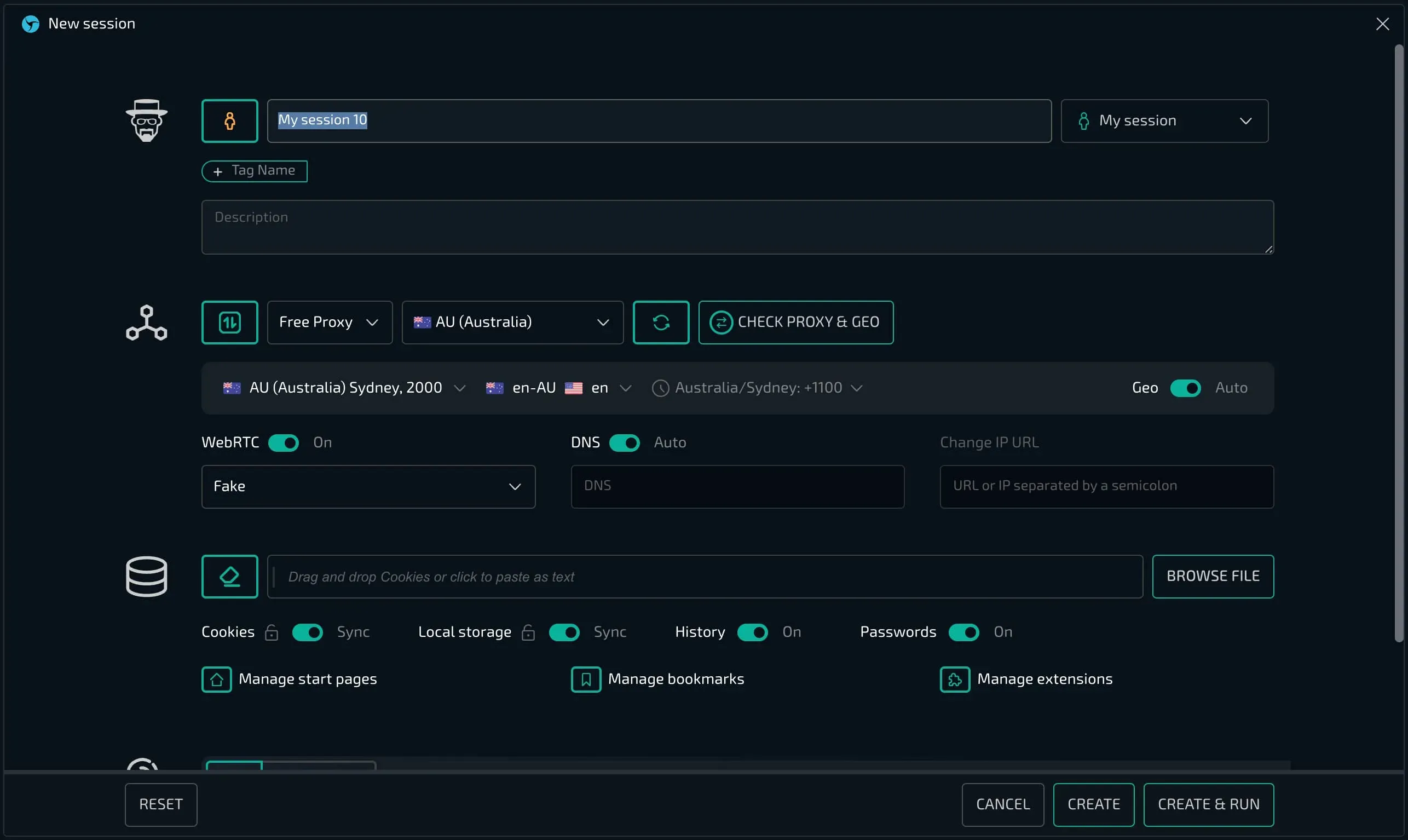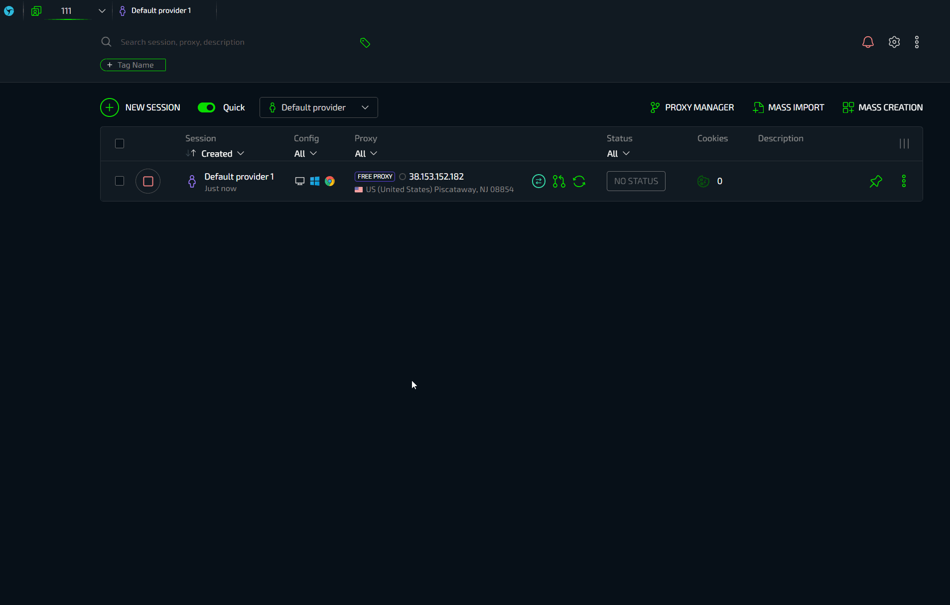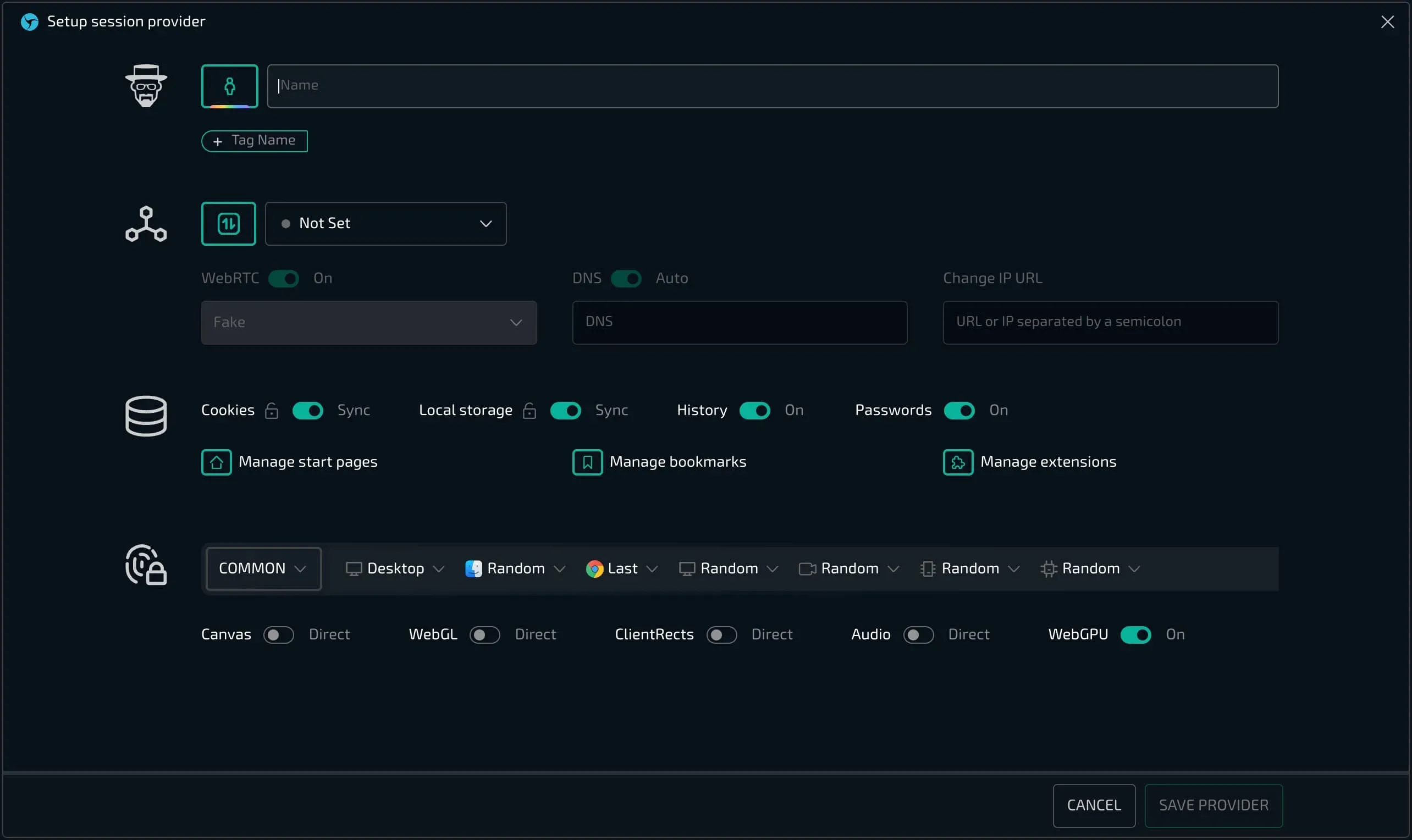 В этом режиме вы можете внести точечные изменения перед созданием профиля. В большинстве случаев это не имеет смысла, если вы правильно настроили провайдер, то все необходимые настройки уже применены (используемый провайдер отображается справа от названия). Поэтому рекомендуем использование быстрого режима - если вам потребуется быстро изменить имя, прокси или описание то вы сможете сделать это прямо в менеджере сессий по клику в необходимое поле.