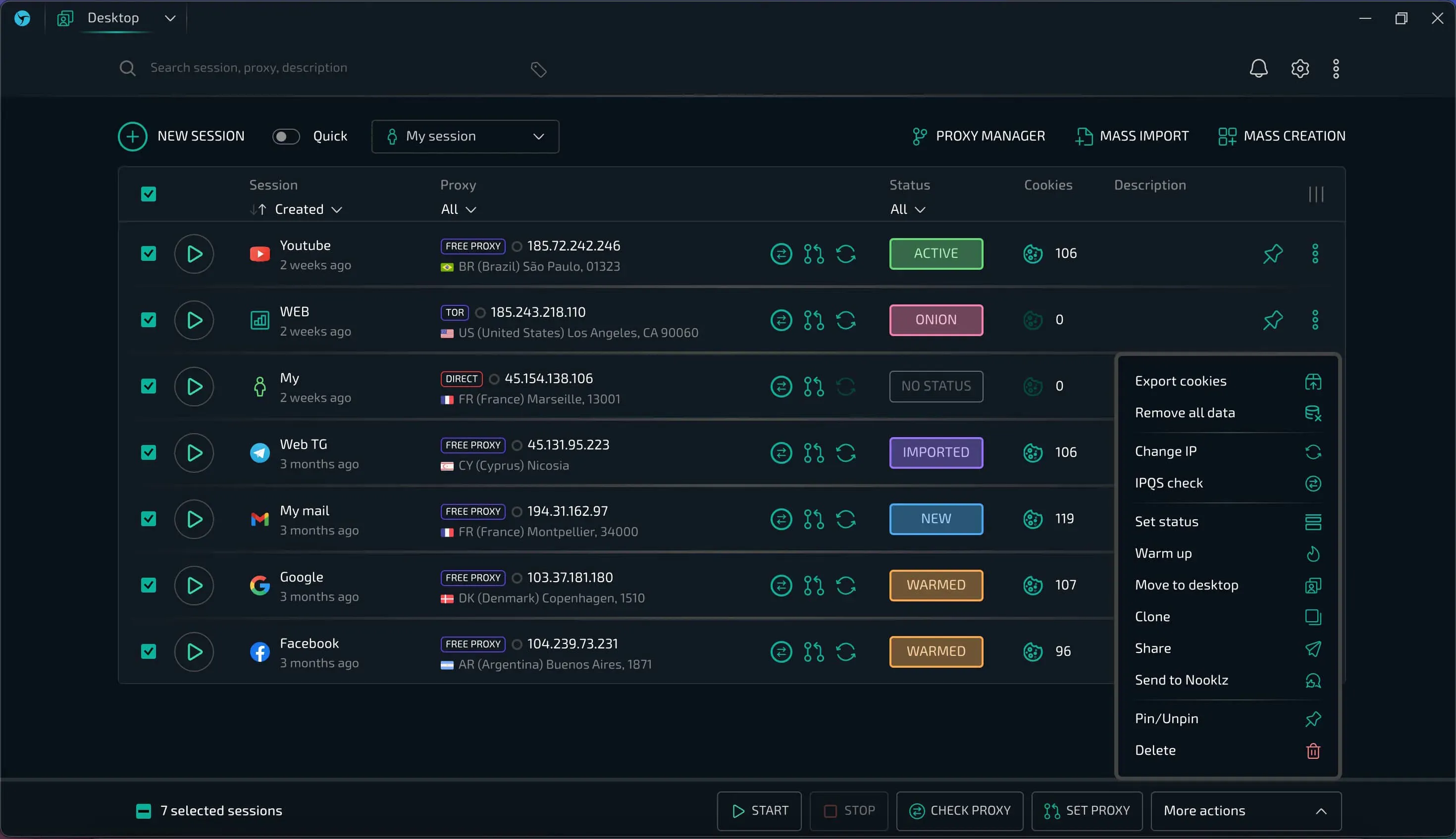 По нажатию на вкладку правой кнопкой мыши вы можете сделать популярные действия (например, сменить IP у прокси) даже без перехода в панель управления.