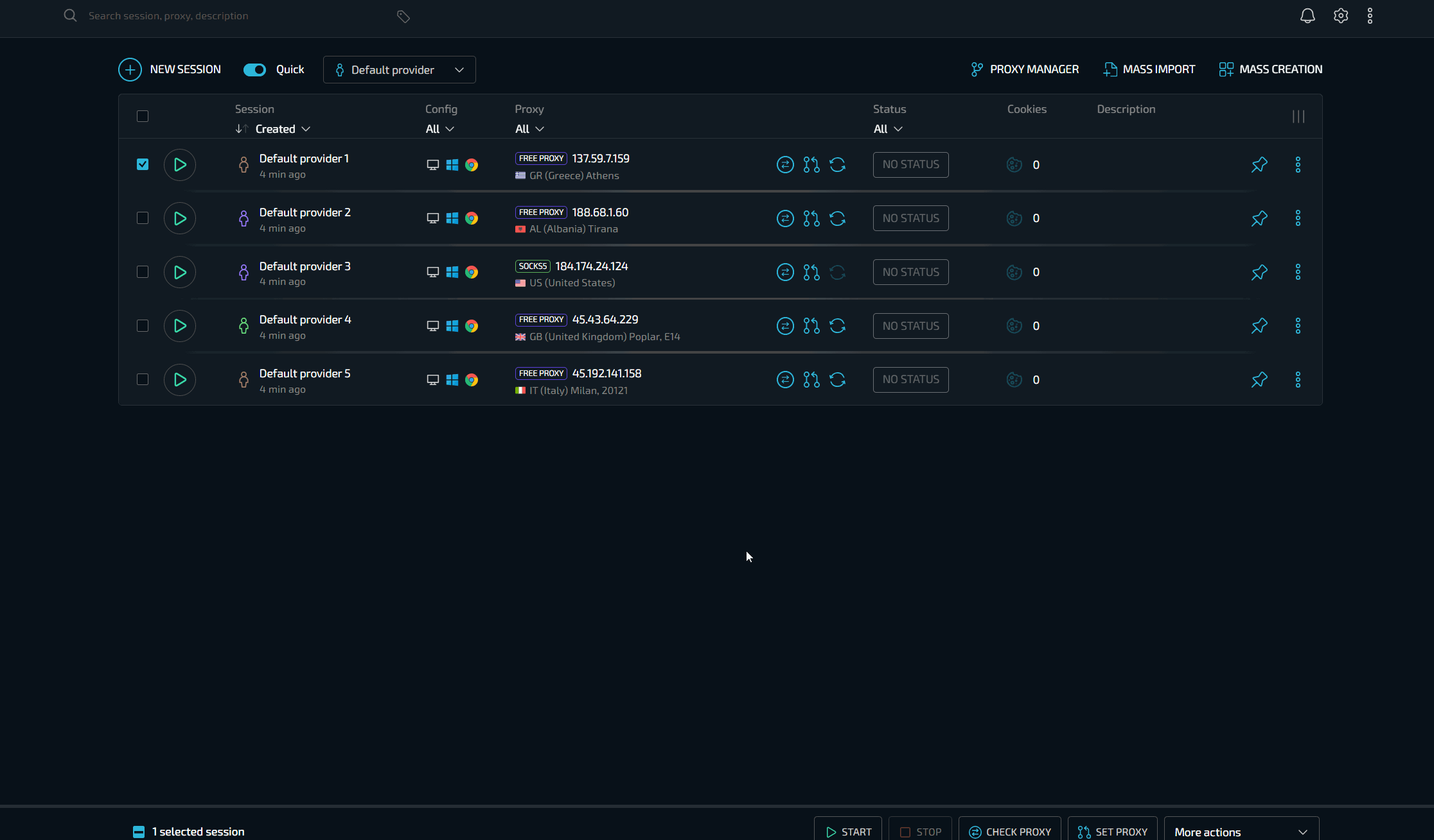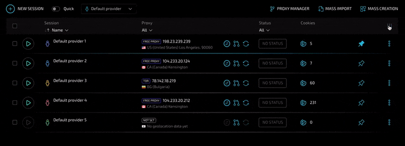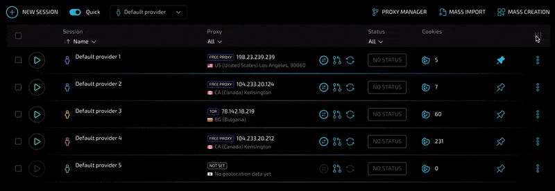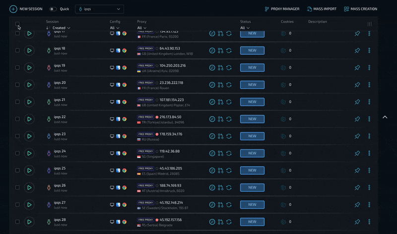 Вы можете указать целый список прокси для последовательного использования. При выборе списка каждый следующий создаваемый профиль будет автоматически использовать прокси из списка до момента его окончания. Это также работает и для массового создания. Представьте себе - создали провайдер, загрузили список прокси, в два клика создали 100 новых уникальных профилей с уже установленными прокси, готовыми к работе.