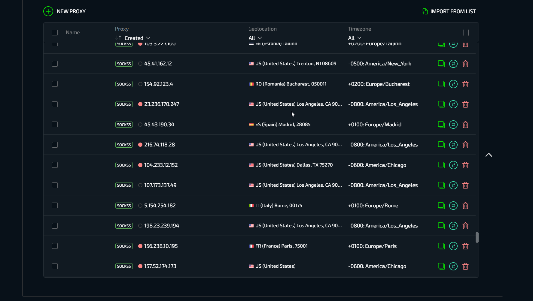 В прокси менеджер встроена удобная система фильтрации прокси по дате создания и использования, геопозиции и временной зоне.