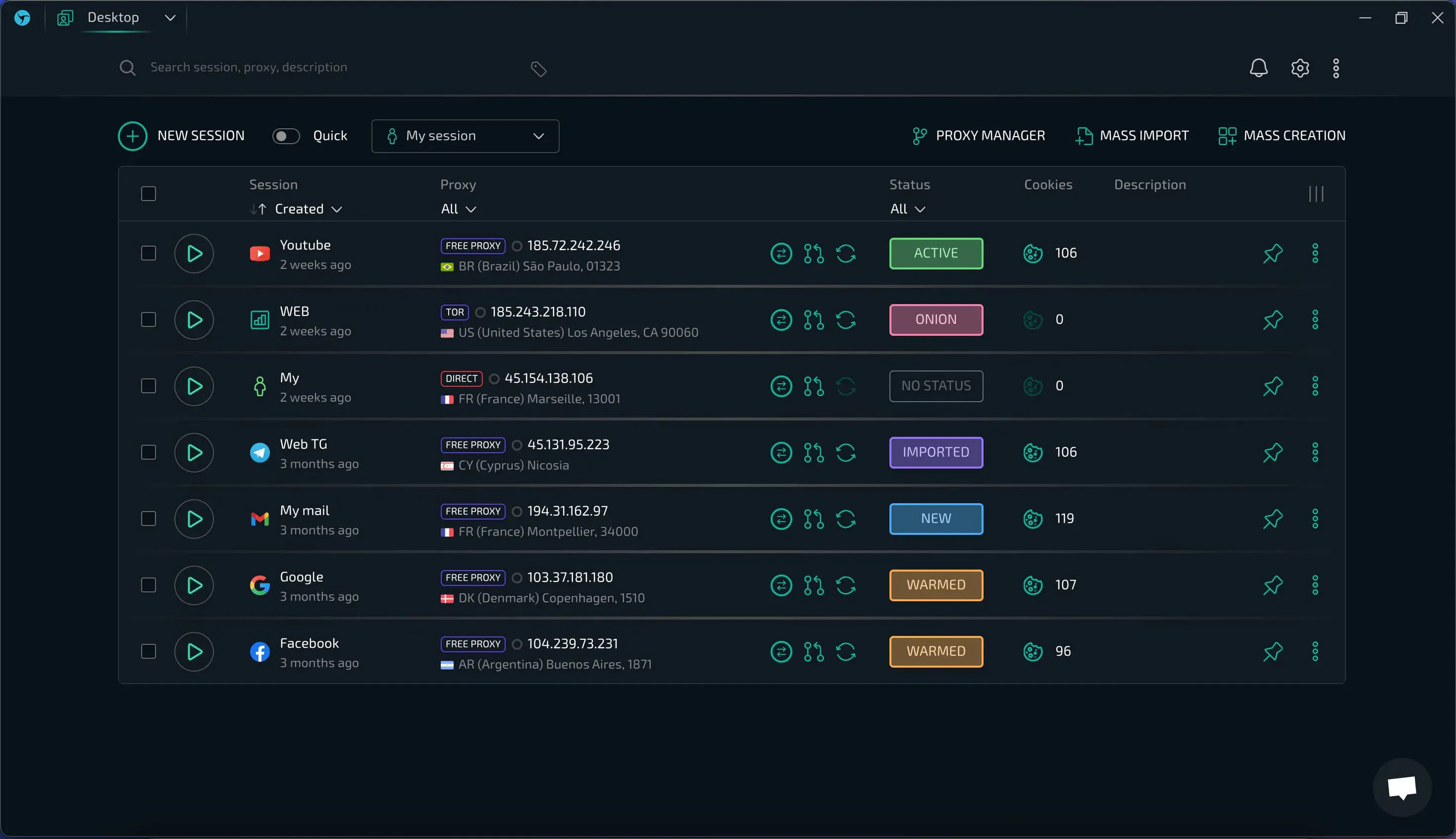 Нет данных аккаунтов, но есть cookies? Хорошо, для этого есть массовый импорт. Выберите нужный провайдер и загрузите множественные файлы прямо в интерфейс - Sphere сама предложит количество создаваемых профилей. Также можете опционально добавить установку статуса “Новый”, чтобы визуально отделить свежесозданные профили. Программа создаст указанное количество профилей на основе выбранного провайдера и автоматически распределит Cookies между ними. Как с массовым импортом - в пару кликов у вас целая армия аккаунтов, готовых к работе.