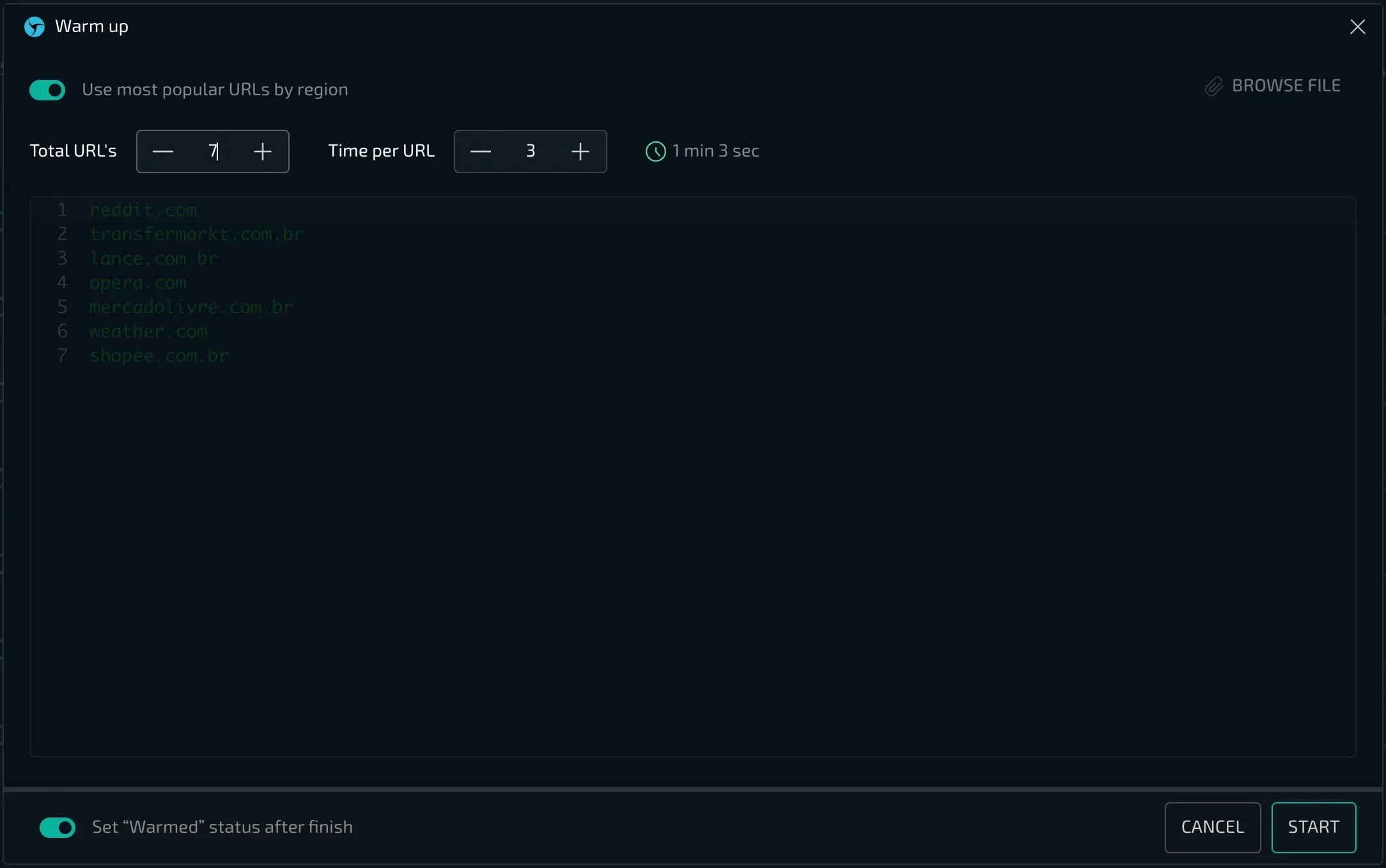 При запуске прогрева браузер предлагает вам использование наиболее популярных сайтов в локации установленного прокси. Если вы массово запускаете прогрев сессий с разной геопозицией, список таких сайтов будет автоматически настроен для каждой из них индивидуально. Вам нужно лишь выбрать количество страниц и задать время пребывания, если хотите.