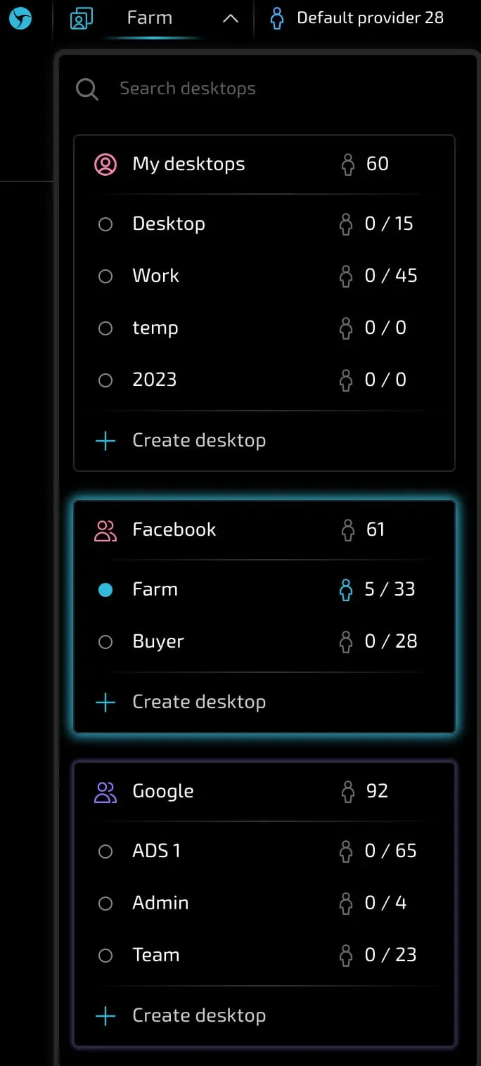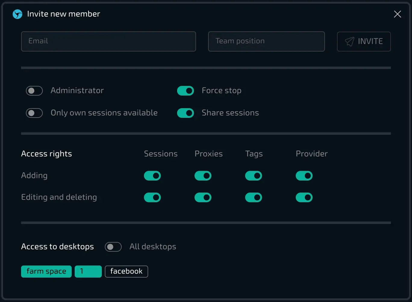 Владелец аккаунта может добавлять пользователей в команду, устанавливать их роли и выбирать доступные для членов команды права. Это относится как к возможности принудительной остановки сессий, создания профилей и добавления прокси, тегов и провайдеров, так и доступов к отдельным рабочим столам! Также можно назначать администраторов, которые могут добавлять других участников и выполнять перемещение профилей между рабочими столами, управляя производственным 'конвейером').