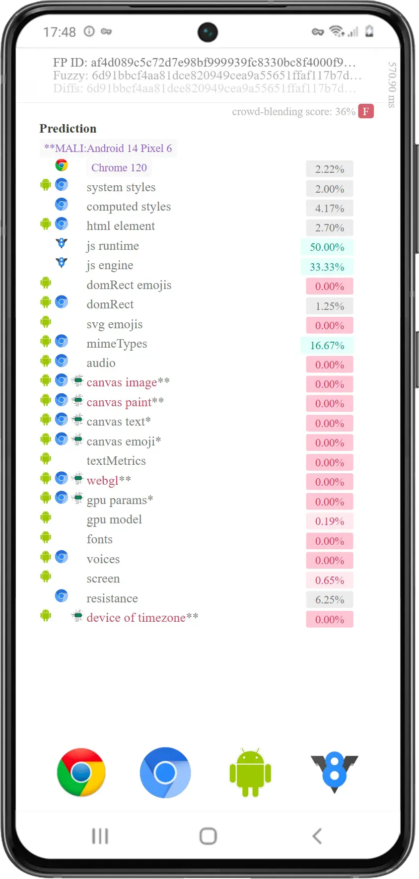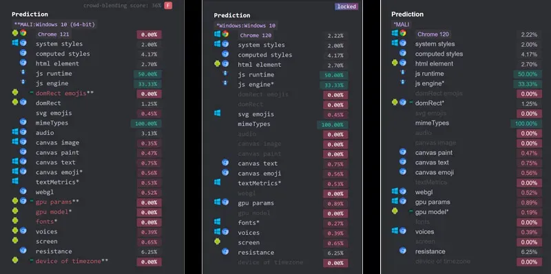 Пример: на формирование отпечатков Canvas и WebGL влияет видеокарта. Если у вас популярная модель, например GeForce GTX1080, то еще целый ряд других моделей будут обладать похожими характеристиками, которые создадут такой же отпечаток. Но как узнать, какие? Гибрид сделает это автоматически. А также подменит еще ряд параметров, которые невозможно определить путем синтетических тестов. При этом сами отпечатки останутся родными, то есть без любых вмешательств, но остальные параметры конфигурации будут уникализированы.